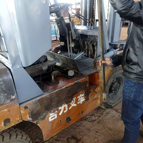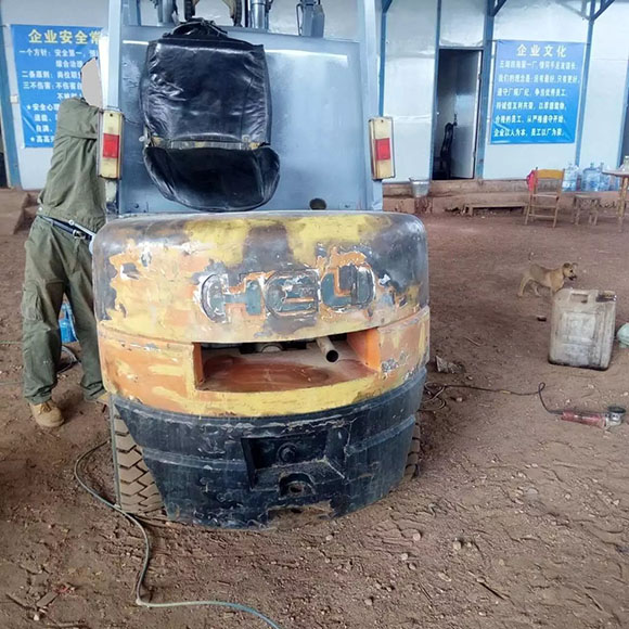 這臺(tái)翻新的叉車,可以肯定的說是假冒偽劣叉車,從圖中我們可以看到配重打磨過的痕跡,黑乎乎的,似乎已經(jīng)準(zhǔn)備完工。