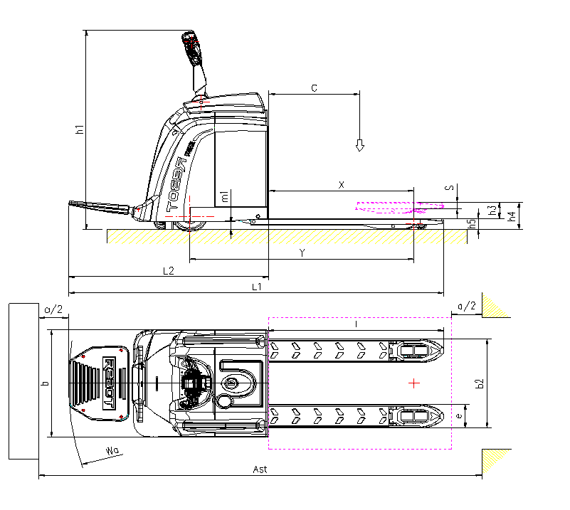 直角堆垛通道寬度,托盤800x1200(1200沿貨叉邊) | Ast mm | 2550 | |||